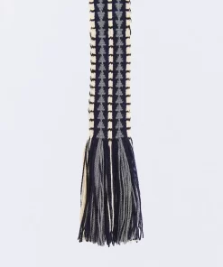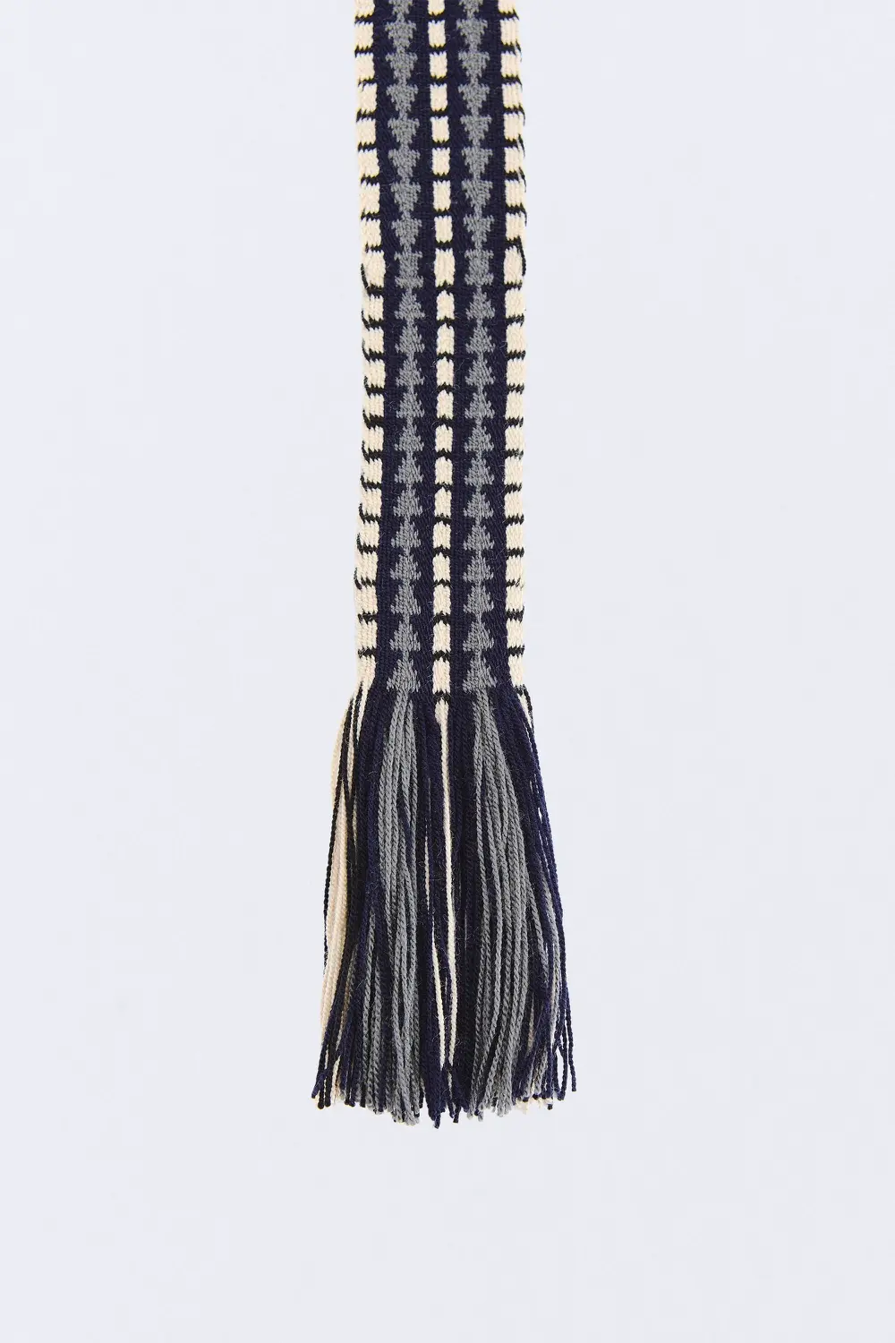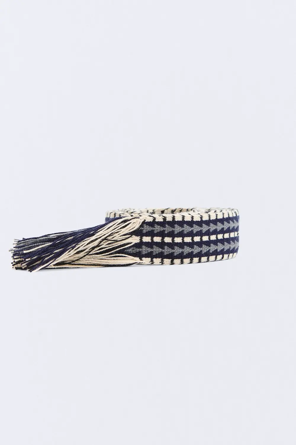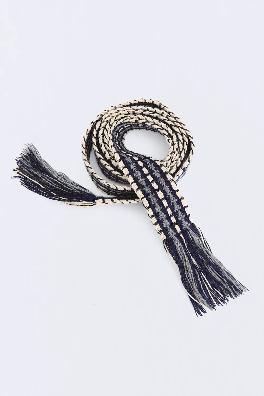 Product descriptionSku:304108-1070 // BELT.WAYUU Fabric belt with fringed finish. In blue, black, and white colors.