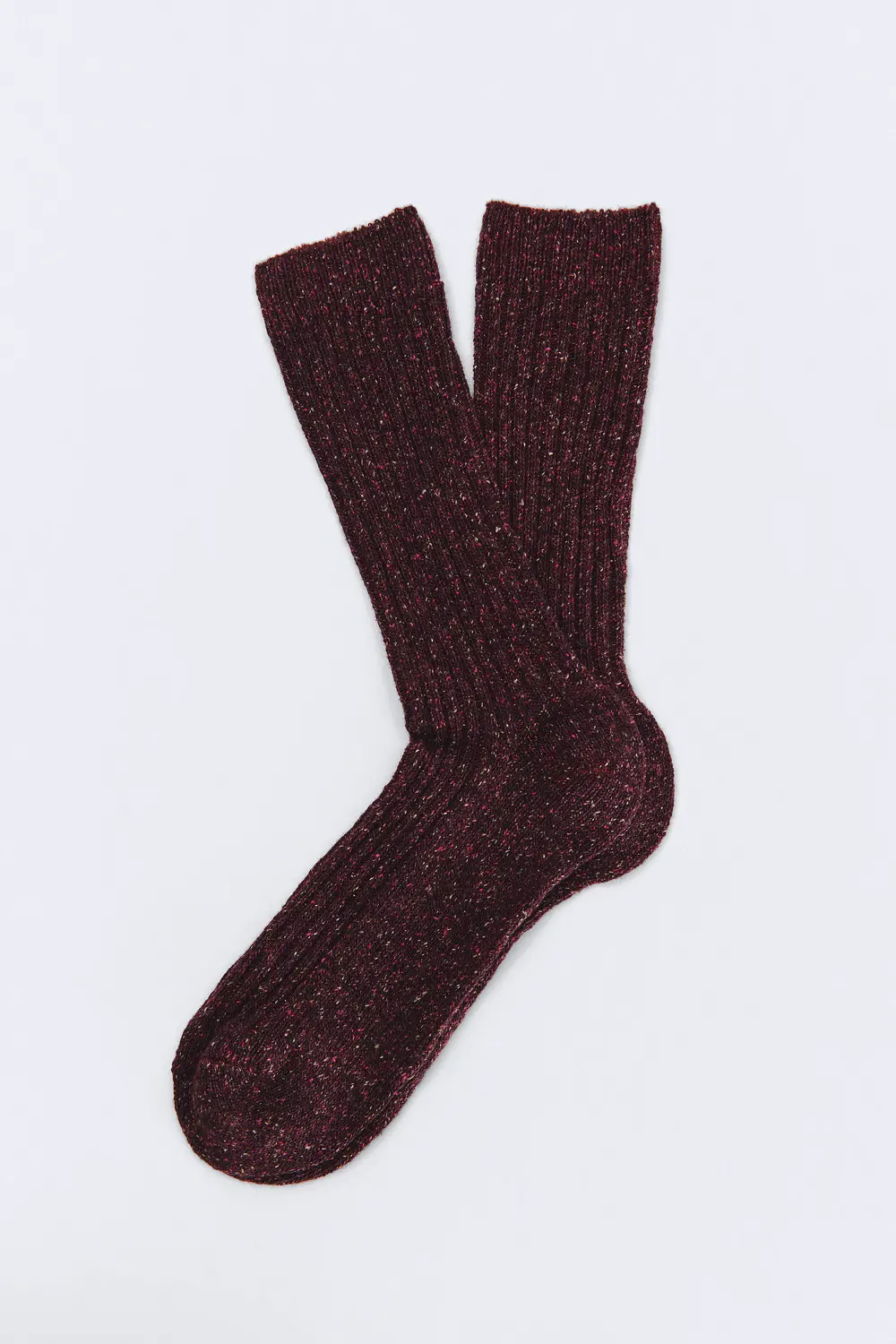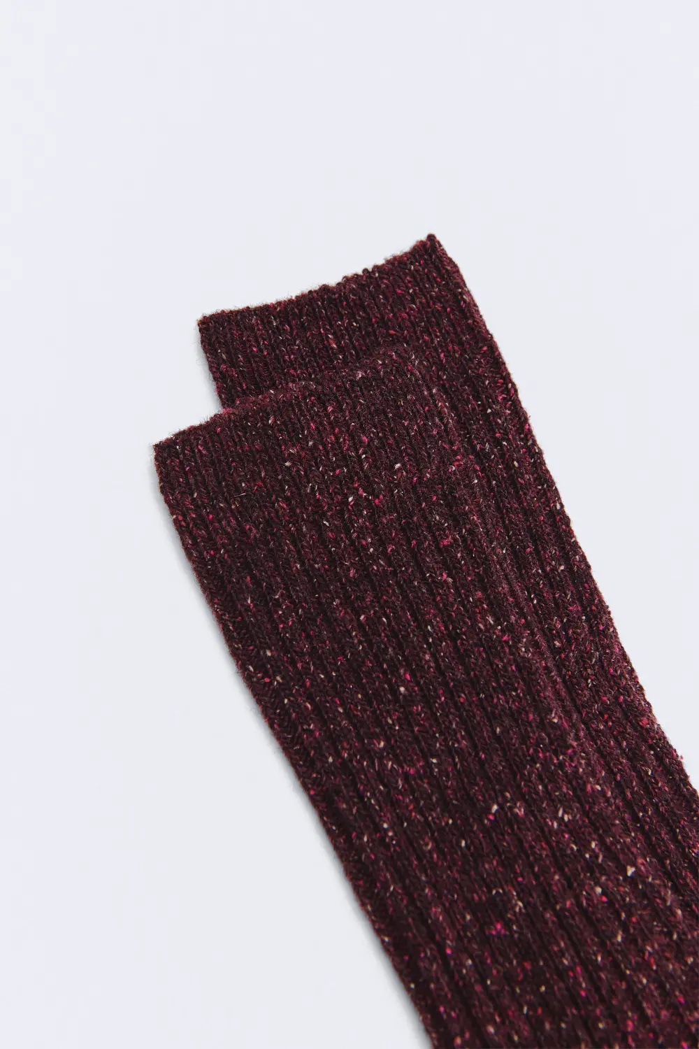 Product descriptionSku:304149-1140 // CAL.COZY MEDIUM Mid-calf sock. Wool and silk blend. Ribbed jaspeado effect. In burgundy color.