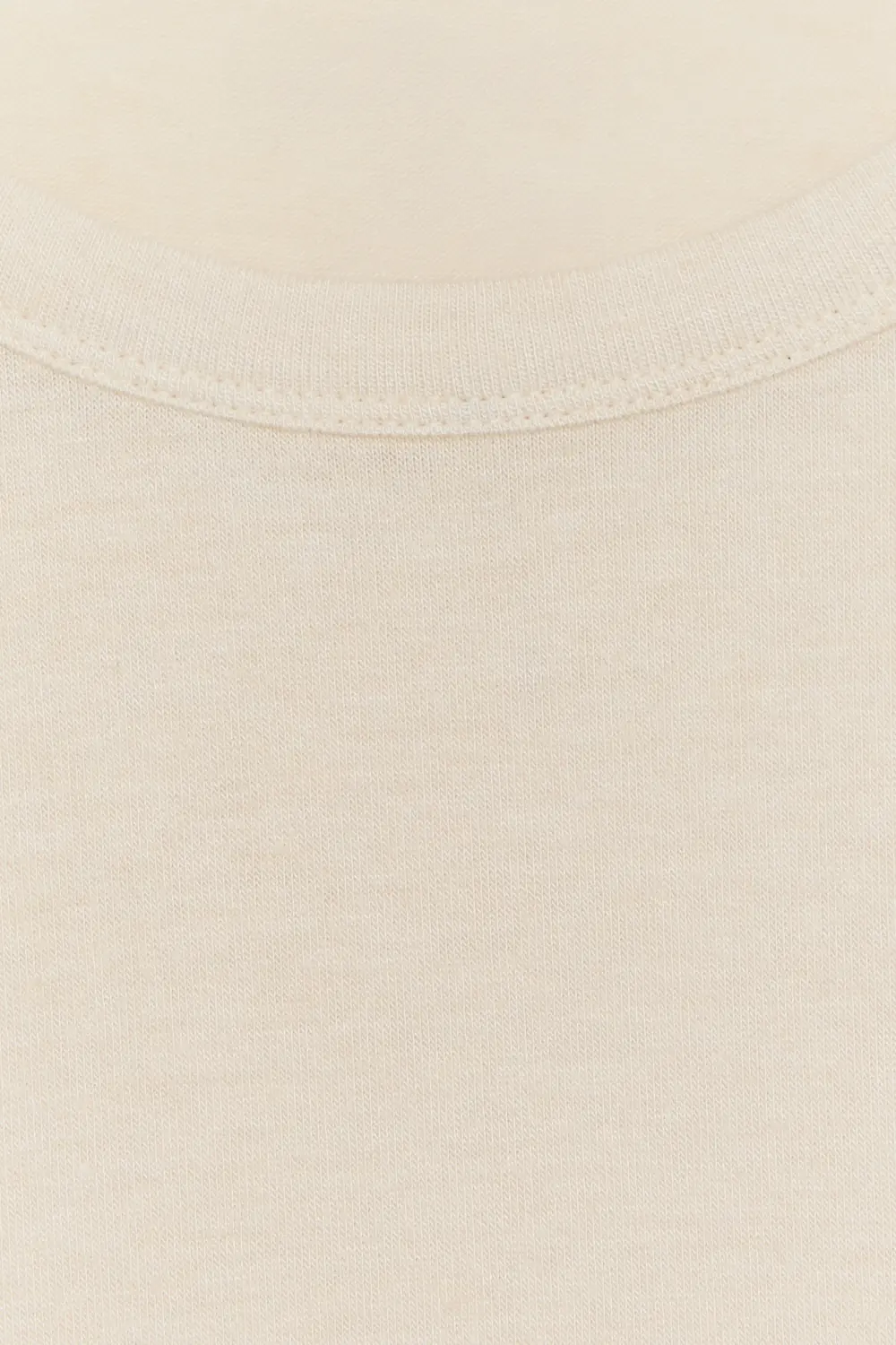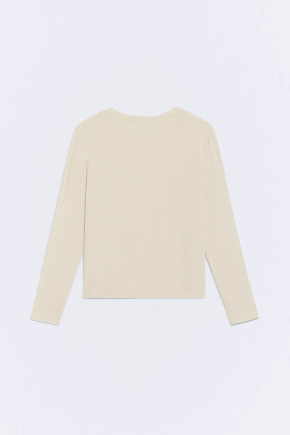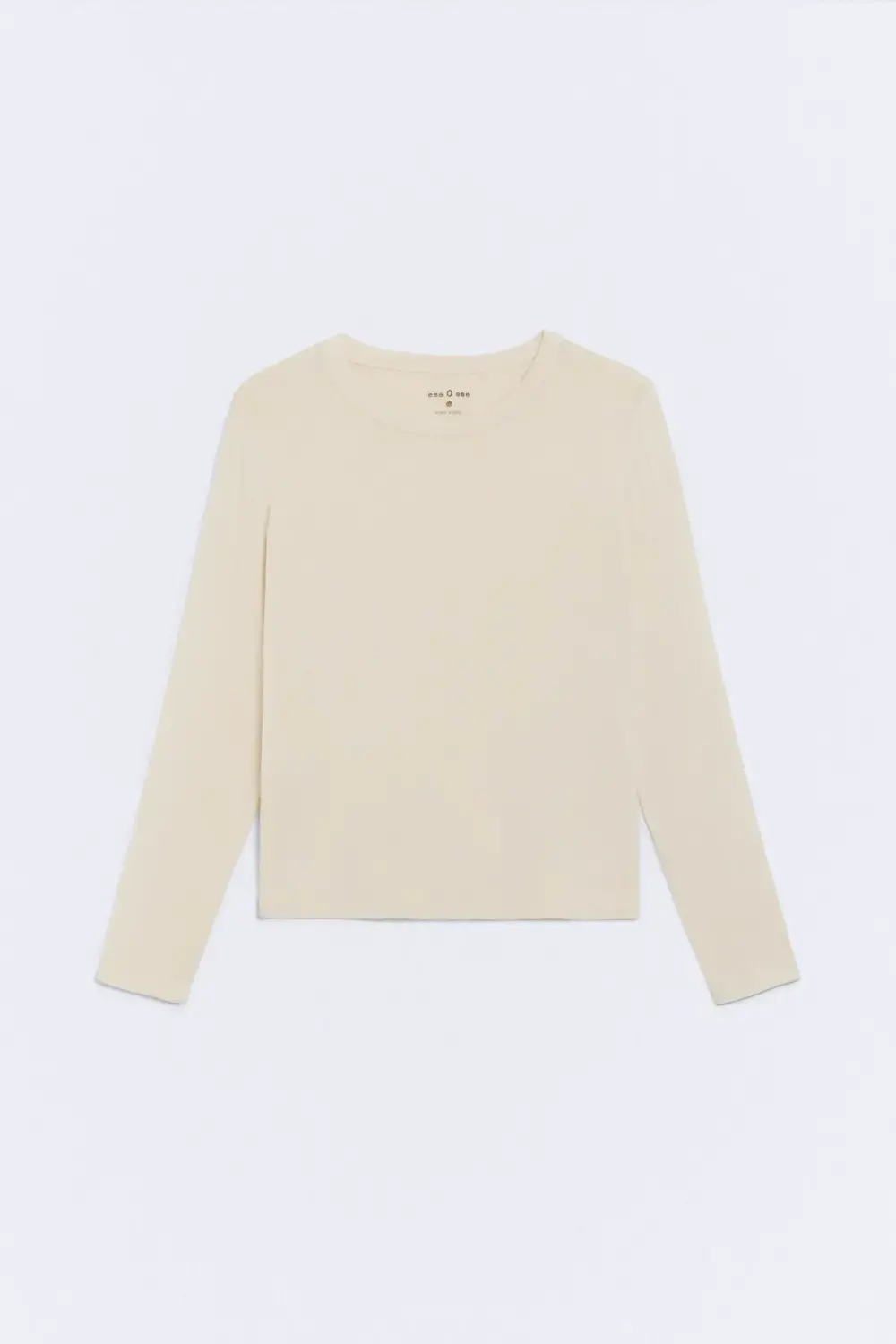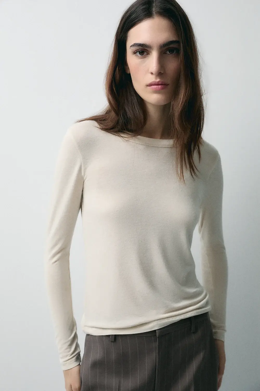 Product descriptionSku:303875-1050 // TS.PRIME Oat basic long-sleeve T-shirt. Round neckline. Quality fabric in viscose and wool. Slightly sheer. Made in Portugal. Garment length for size S: 56 cm.
