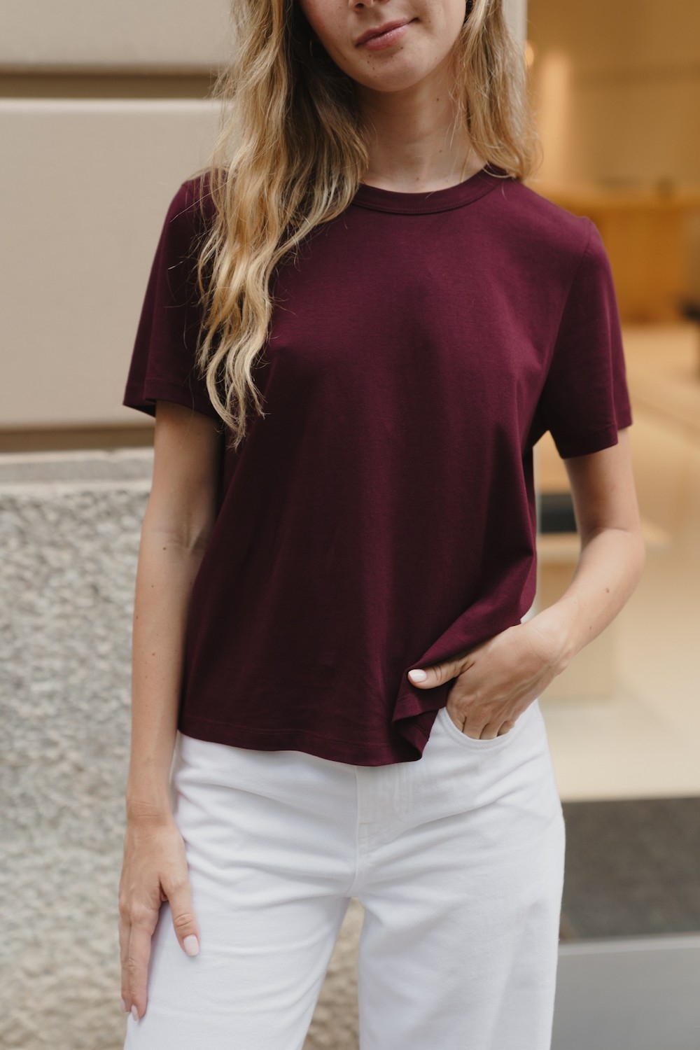 Product descriptionSku:303876-1140 // TS.TRENDY Basic short-sleeved T-shirt. Burgundy color. Round neckline. 100% organic cotton fabric. Made in Portugal. Garment length for size S: 57 cm.