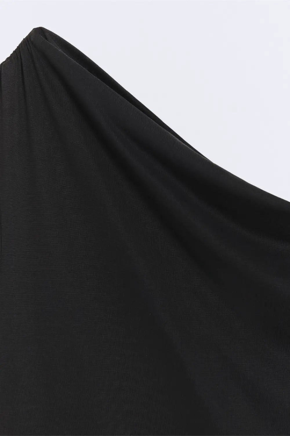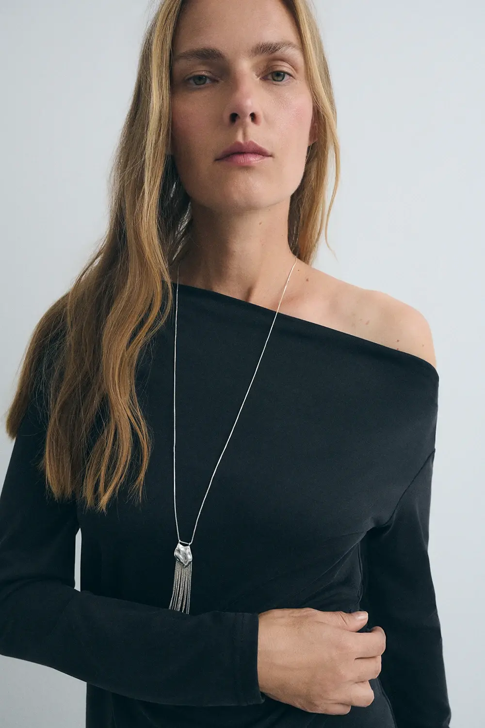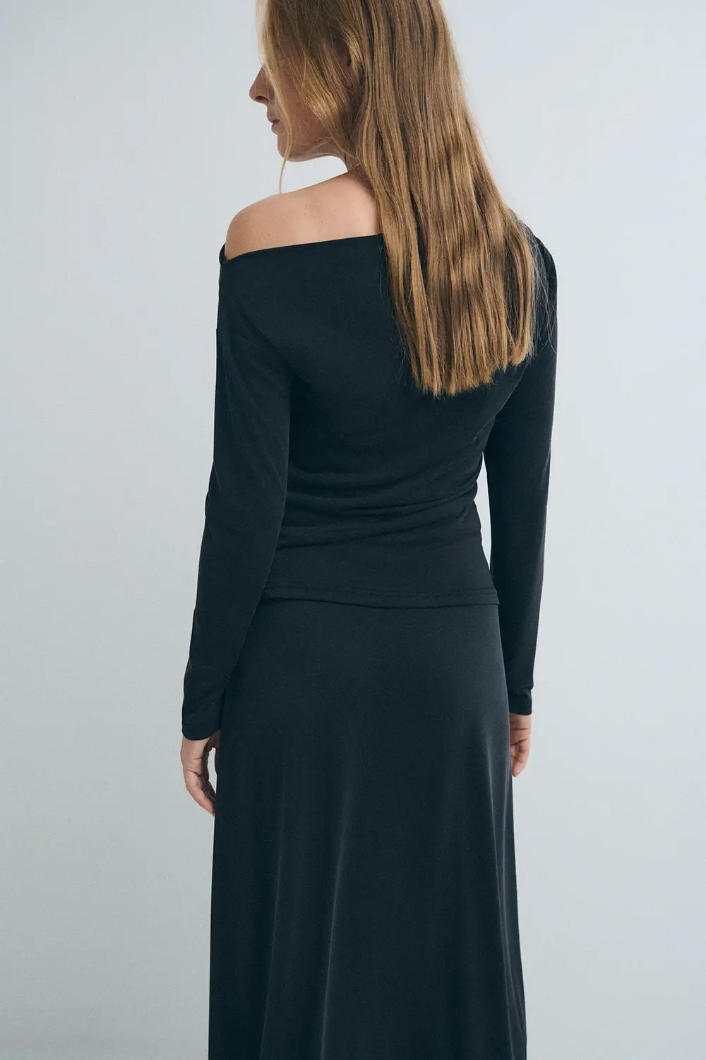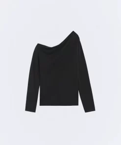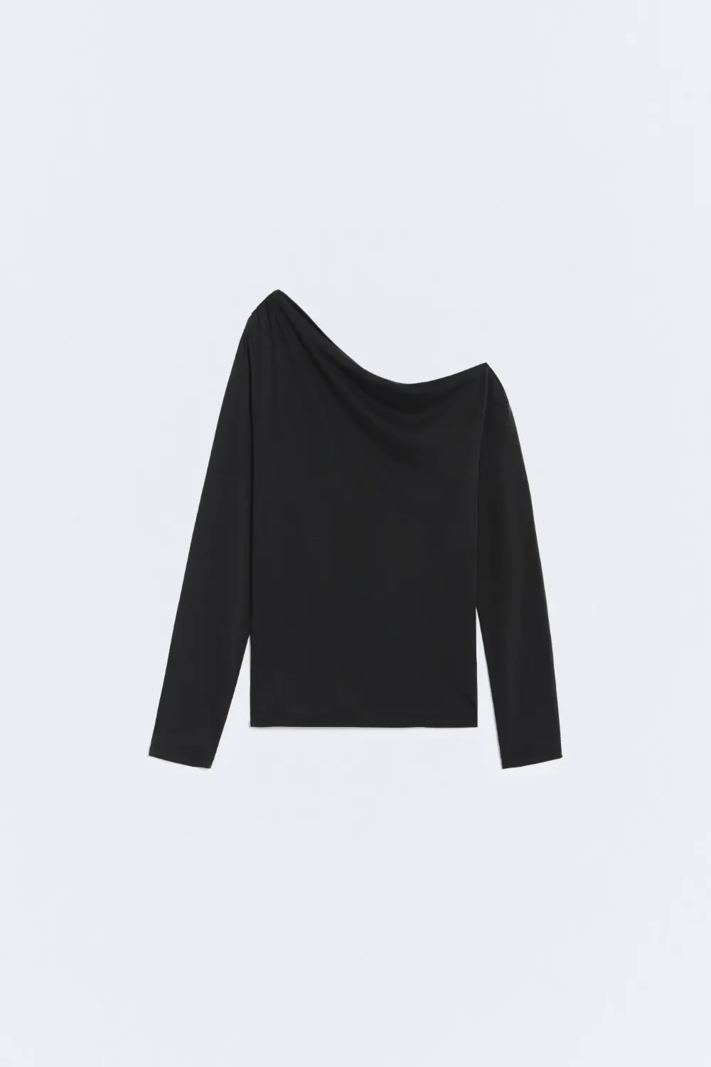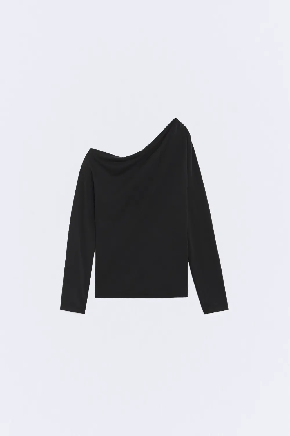 Product descriptionSku:304148-1100 // TS.NICOLE Asymmetric neckline T-shirt. Long sleeves. Cupro-like fabric quality. Fitted fit. Garment length for size S: 54 cm.