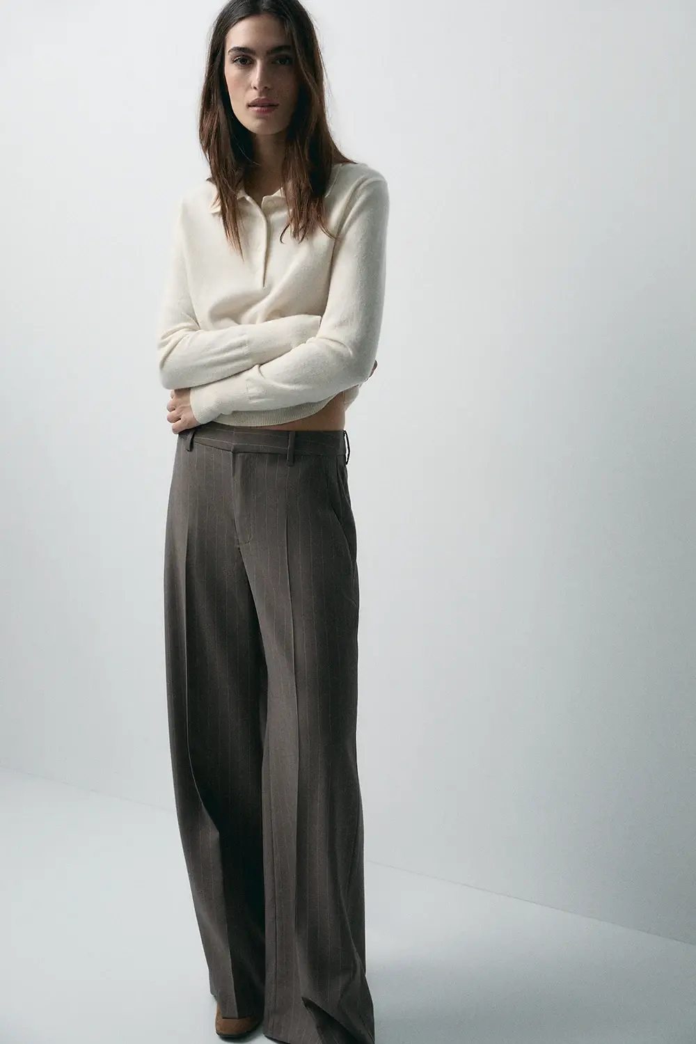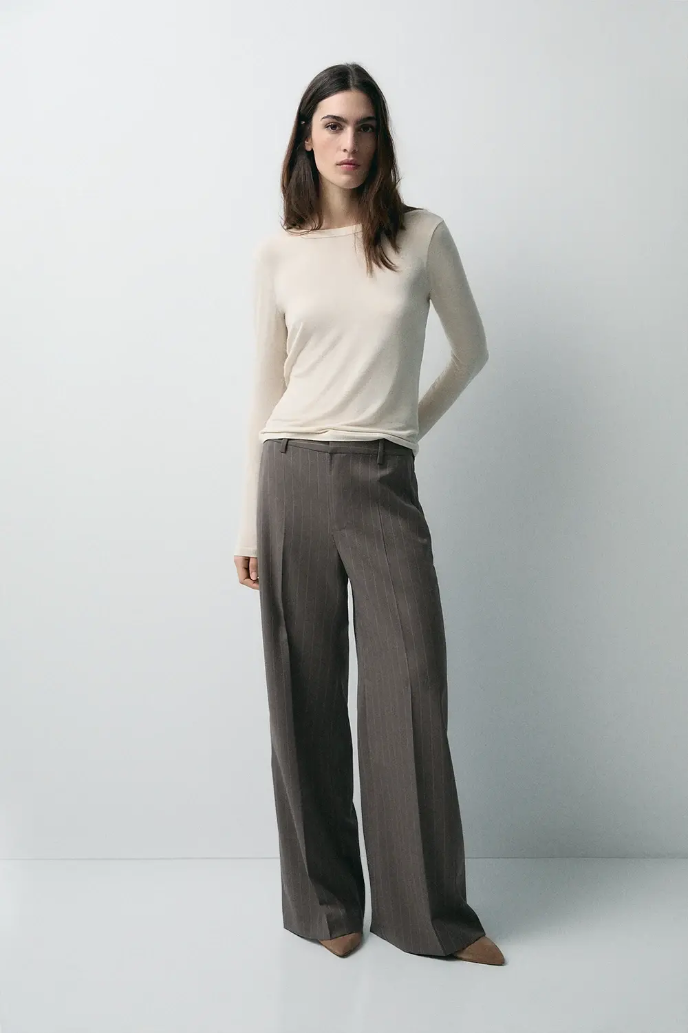 Product descriptionSku:304073-1170 // PANT.DIPLOMATIC Long tailored trousers. Pinstripe. Wool and recycled polyester. Mid-rise. Belt loops. Two side pockets. Hook and zipper closure. Front crease line. Flare cut. Vest and blazer set. Garment length for size S: 105 cm