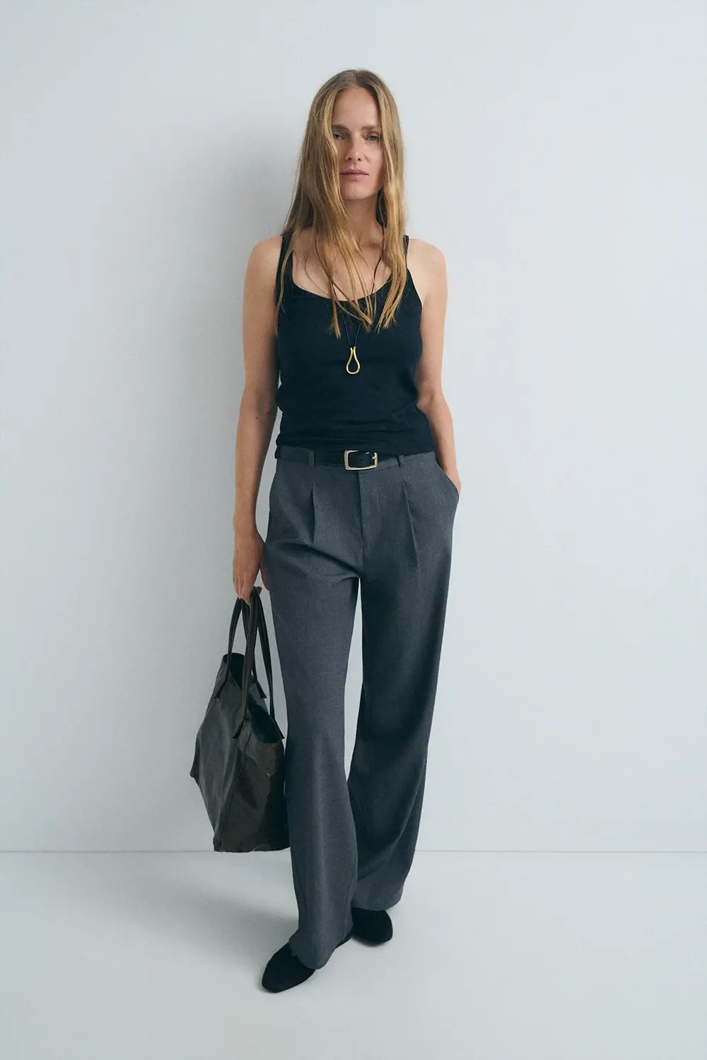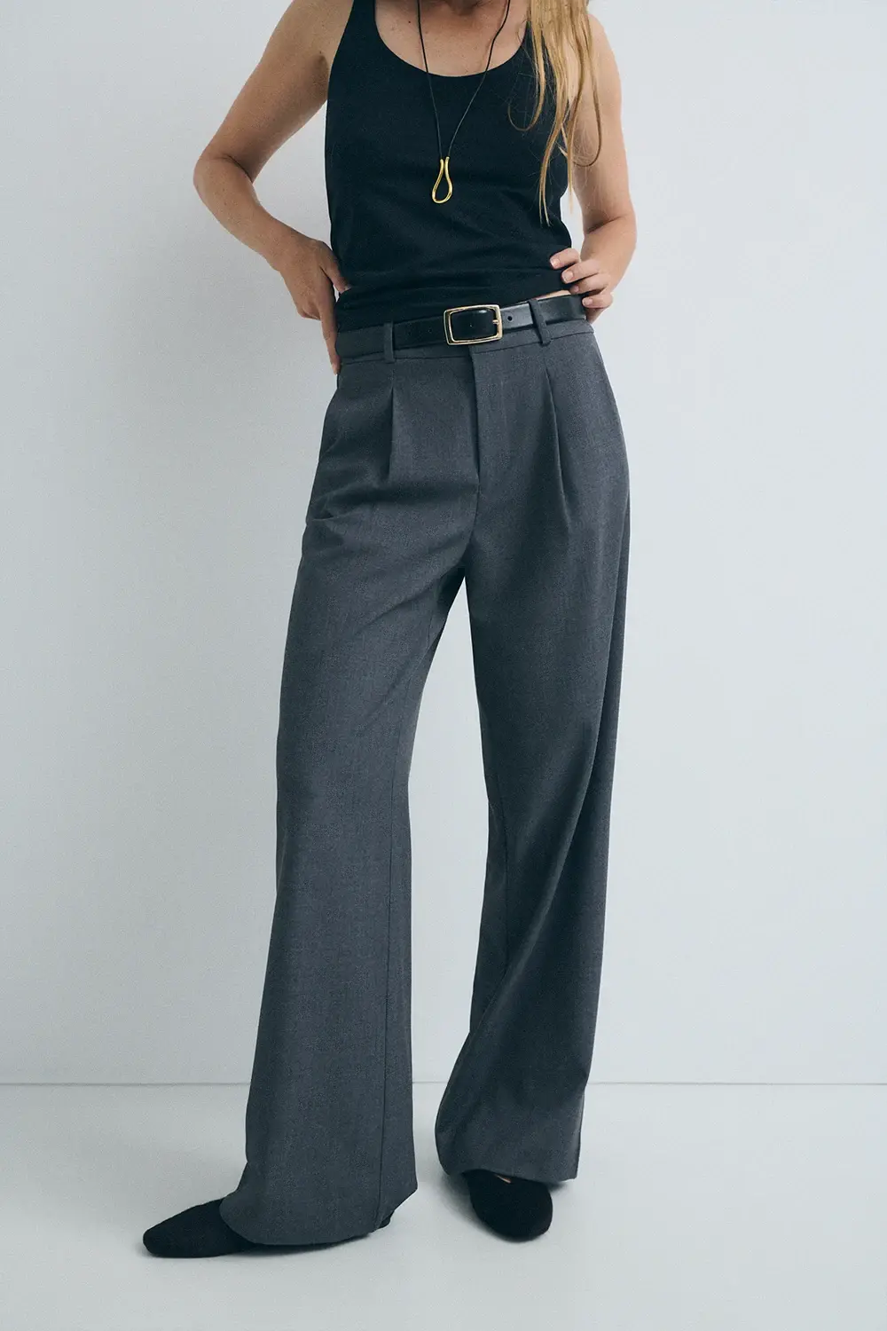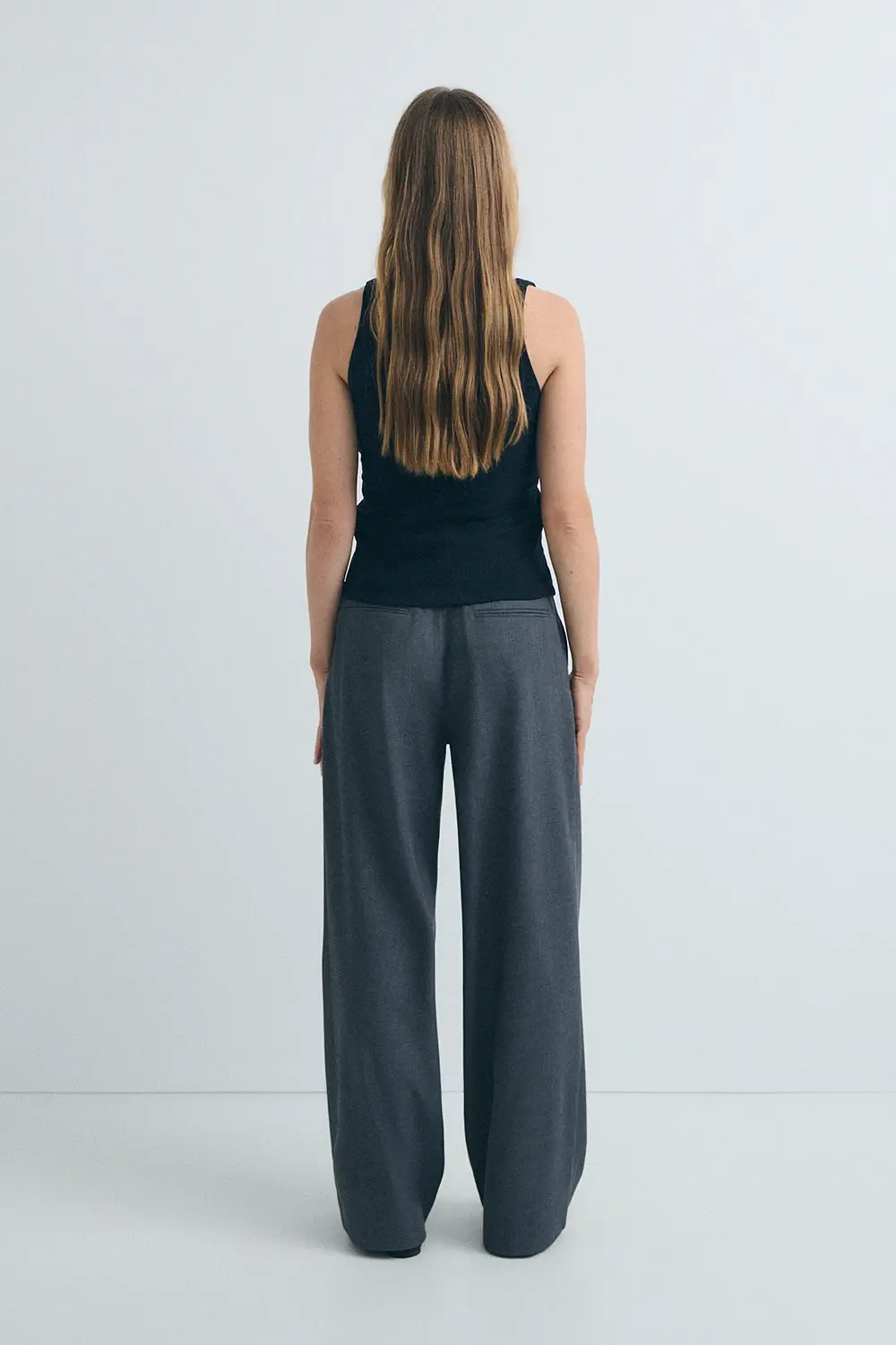 Product descriptionSku:304225-1090 // PANT.CLARCK Tailored long trousers in a wool, viscose, and recycled polyester blend. Mid-rise with belt loops. Front pleat detail. Diagonal side pockets. Closure with metal hook and zipper. Back pleats and welt pocket. Wide leg. Loose fit with slightly flared cut. Garment length for size S: 105 cm.