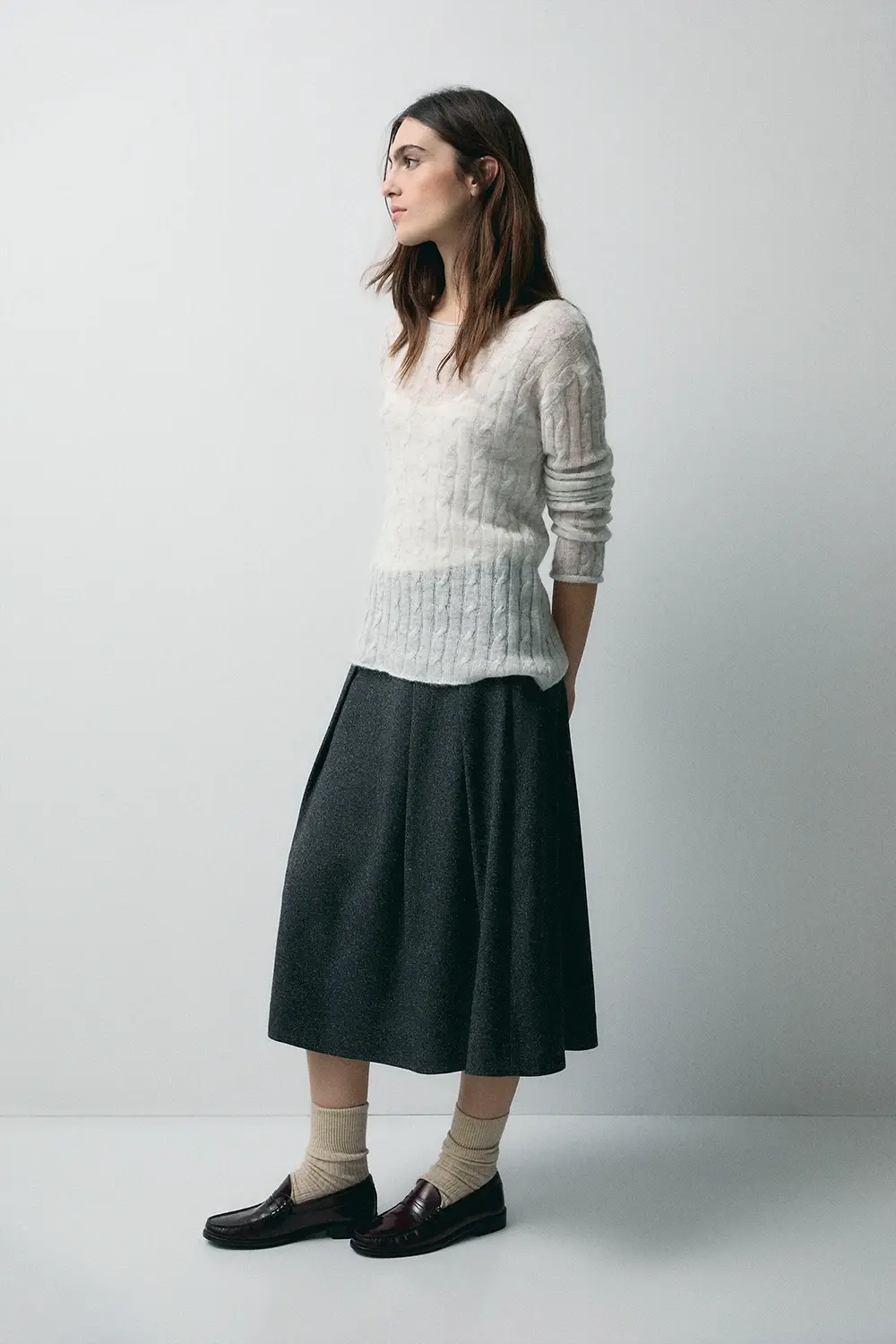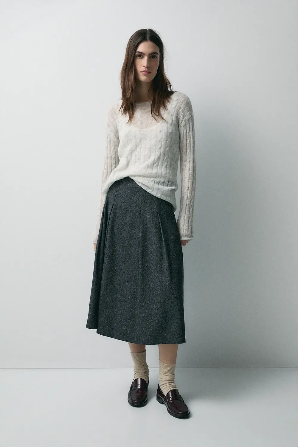 Product descriptionSku:304083-1100 // F.EVERETT High-waisted pleated skirt. In marled cheviot-style fabric. With lining. Flared fit. Side zipper closure. Garment length for size S: 82.8 cm.