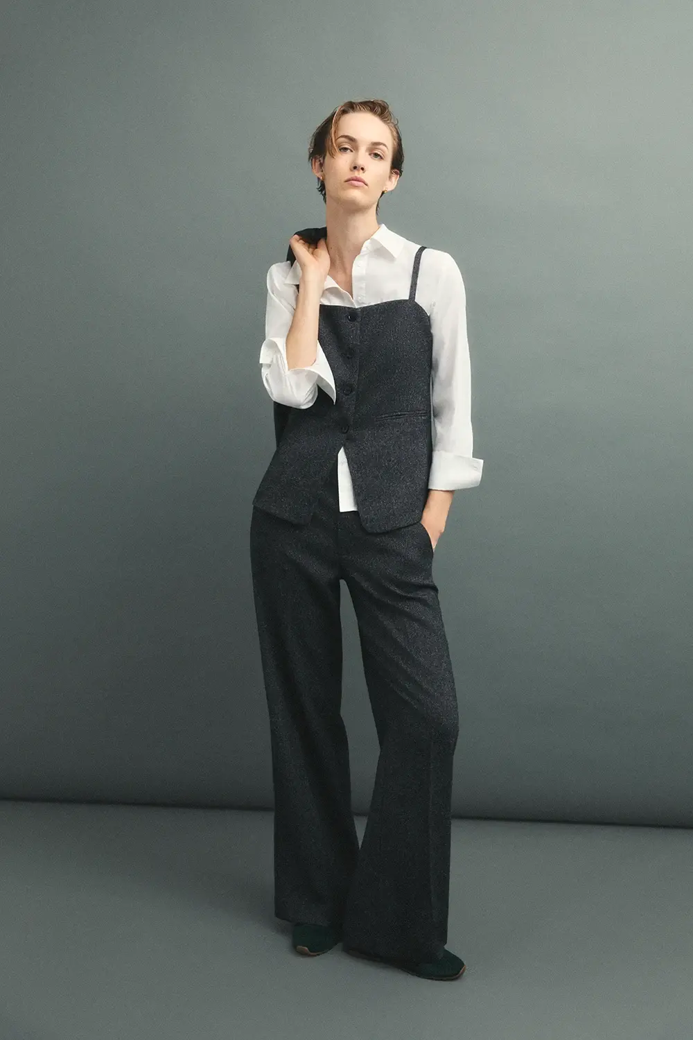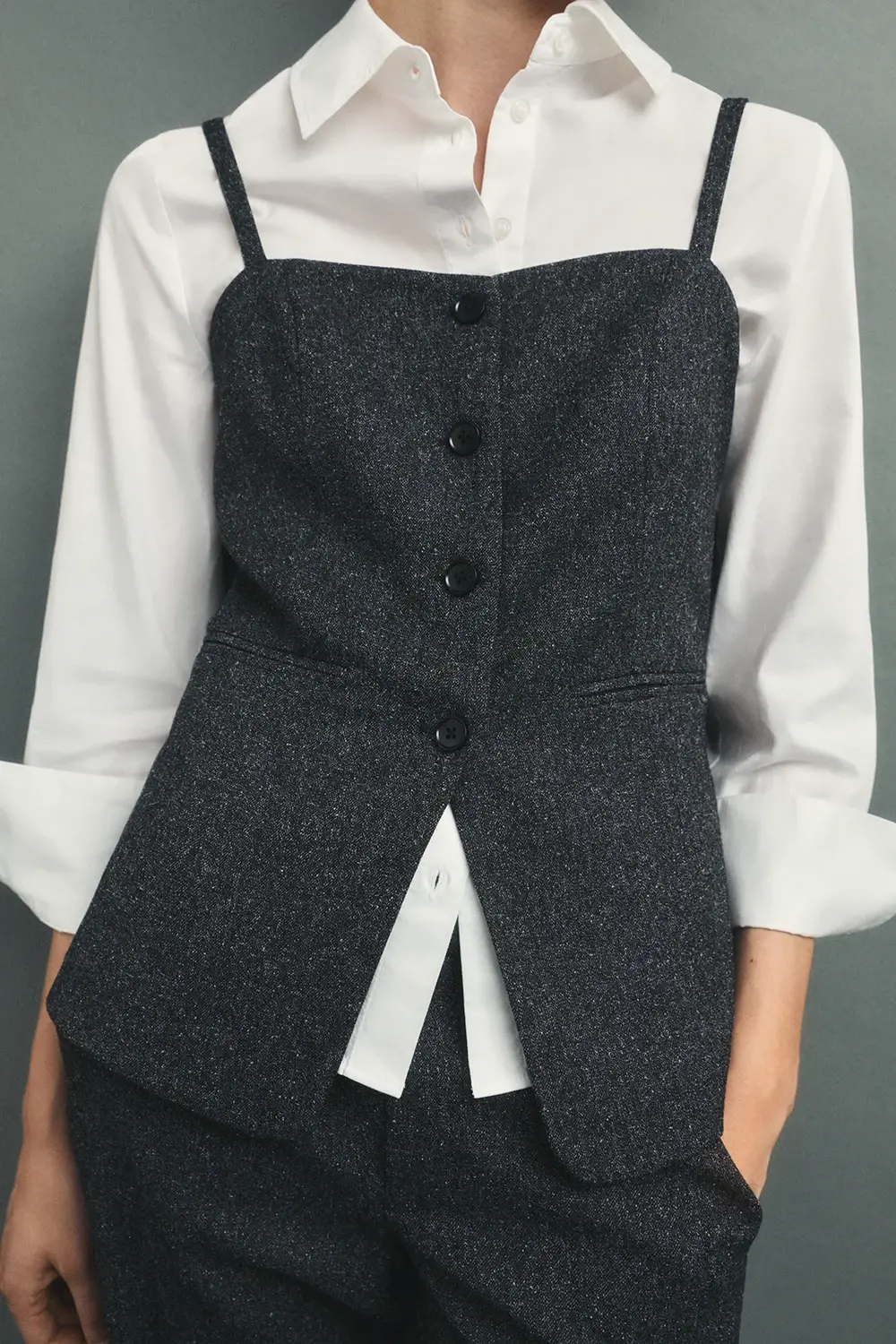 Product descriptionSku:304081-1100 // CHALECO.EVERETT Long tailored vest. Marled cheviot-style fabric. Made from recycled fibers. Straight neckline with straps. Single central button fastening. Lined with polyester satin. Slim fit. Matching blazer and trousers. Garment length for size S: 47.5 cm.