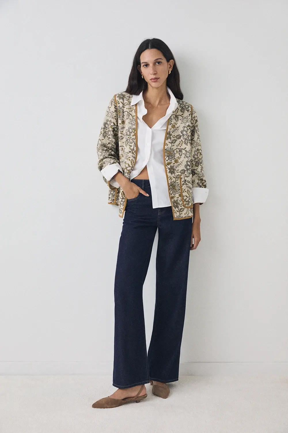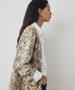 Product descriptionSku:303937-1050 // KIMONO.MORRIS Oversize kimono with floral print in rustic BCI cotton fabric. Wide sleeves. Contrast brown trim. Two front patch pockets. Garment length in size S: 66 cm.