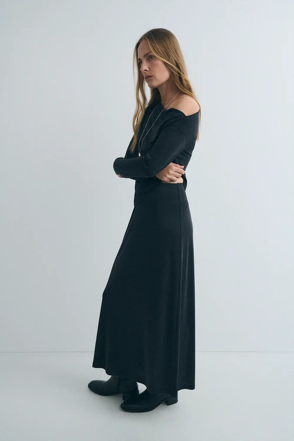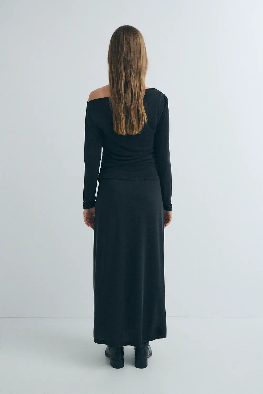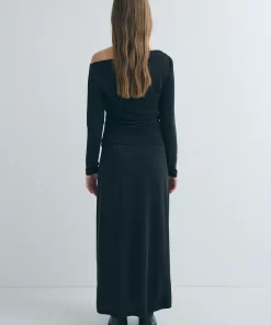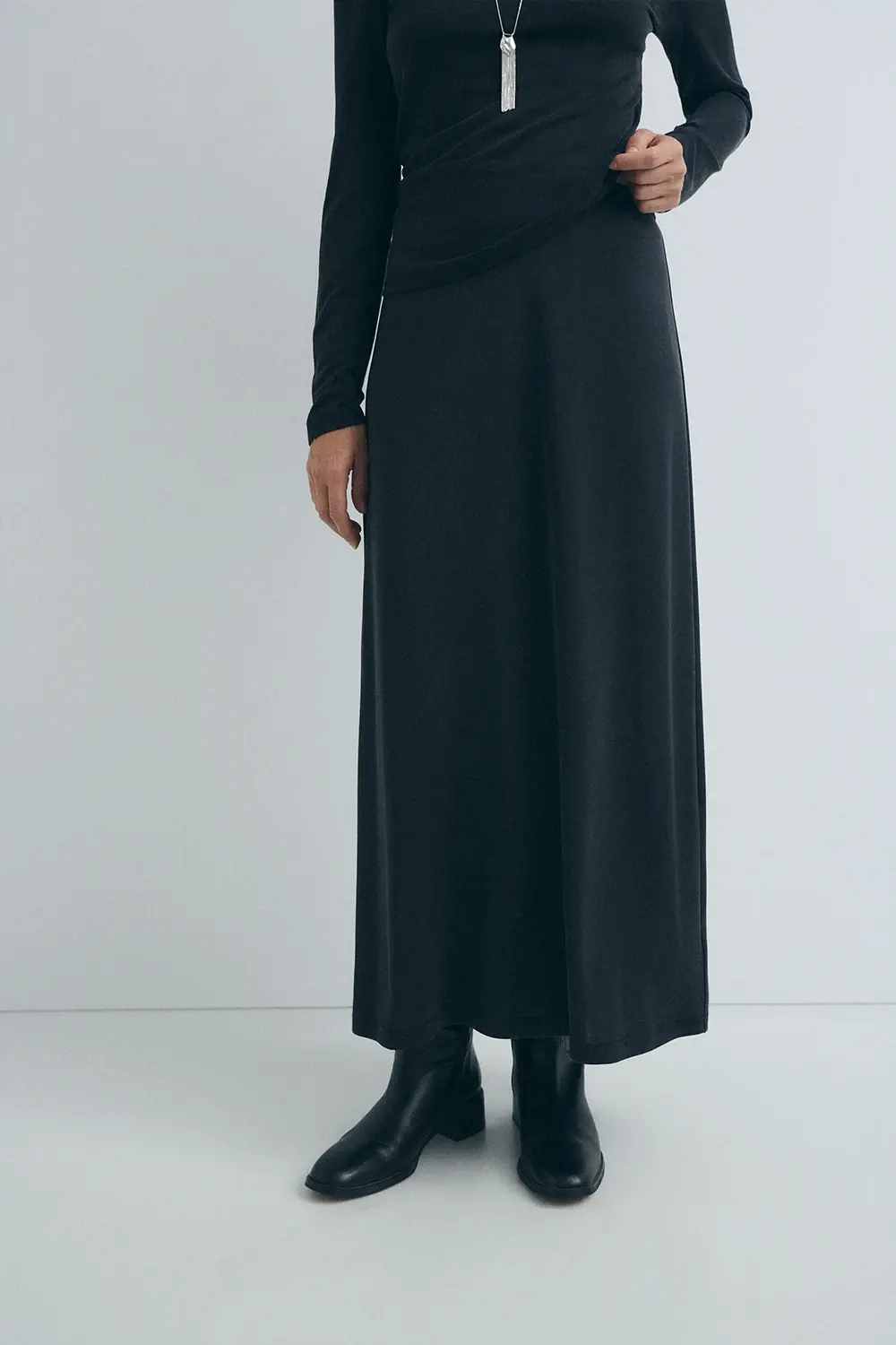 Product descriptionSku:304147-1100 // F.NICOLE Long flowing skirt. Elastic waistband on the inside. Stretch fabric. No closure. Cupro-like fabric quality. Garment length for size S: 90 cm.