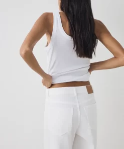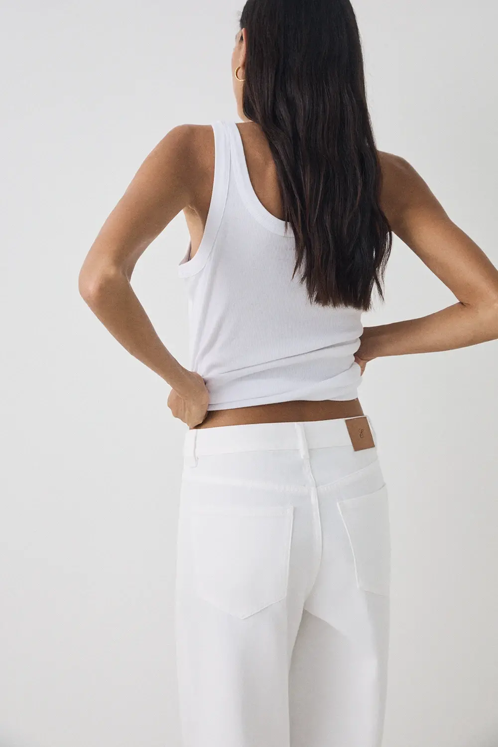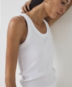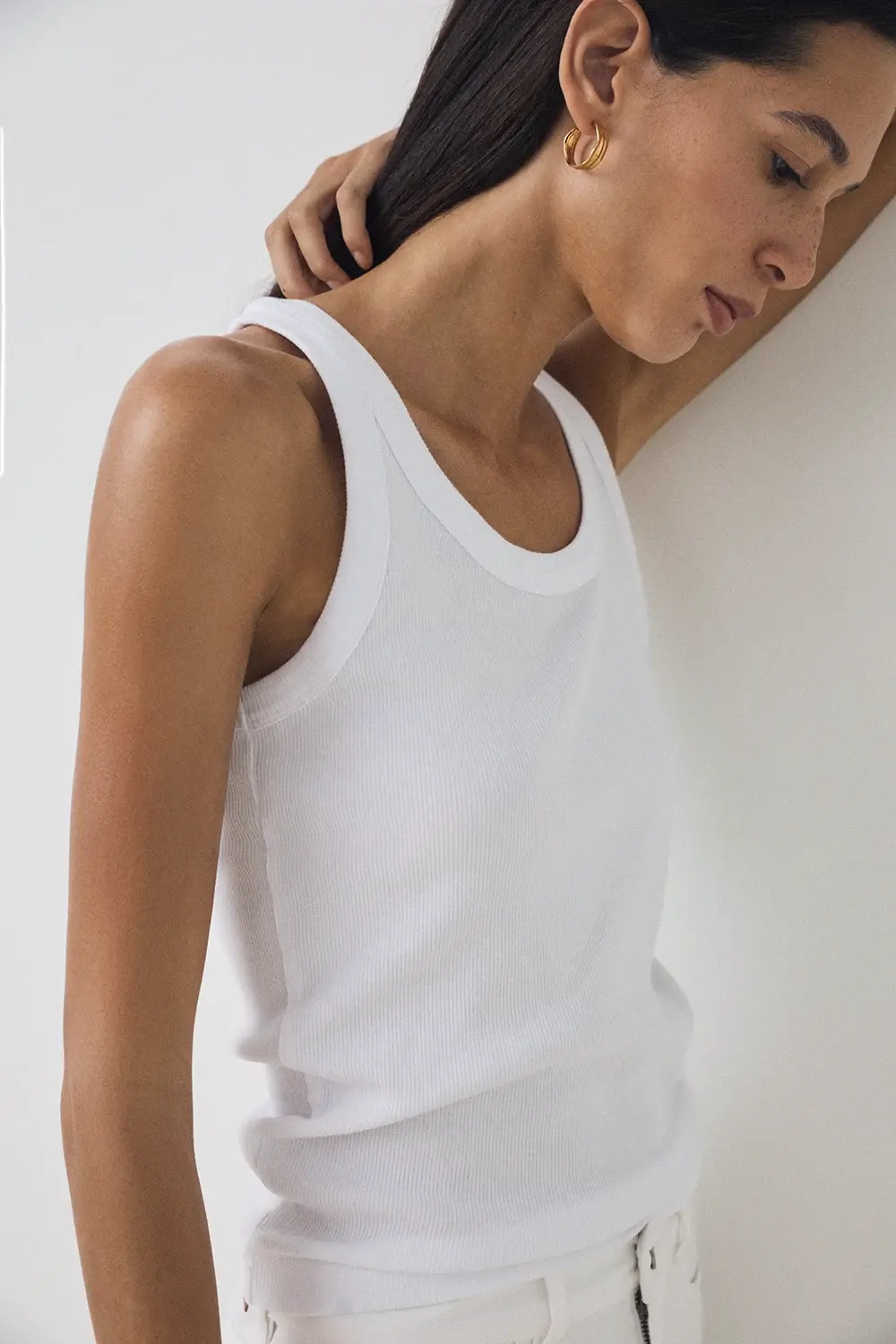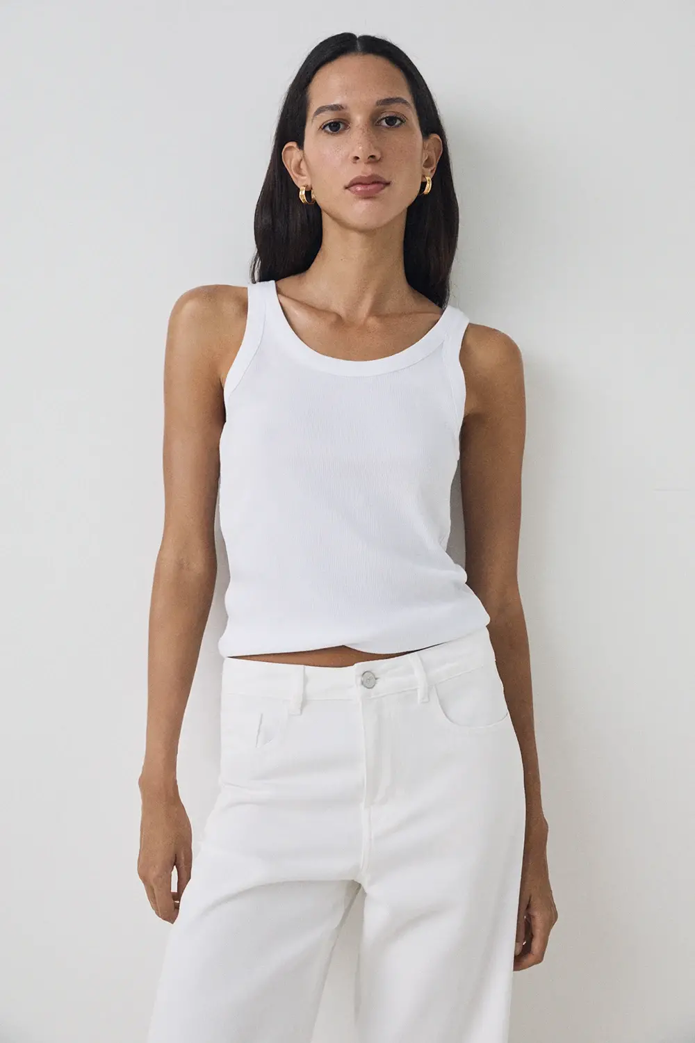Product descriptionSku:304323-1010 // TANK.C.COLA Basic ribbed tank top in white. Made in Portugal. Organic cotton fabric. Wide straps. Round neckline. Slightly fitted. Garment length for size S: 56 cm.