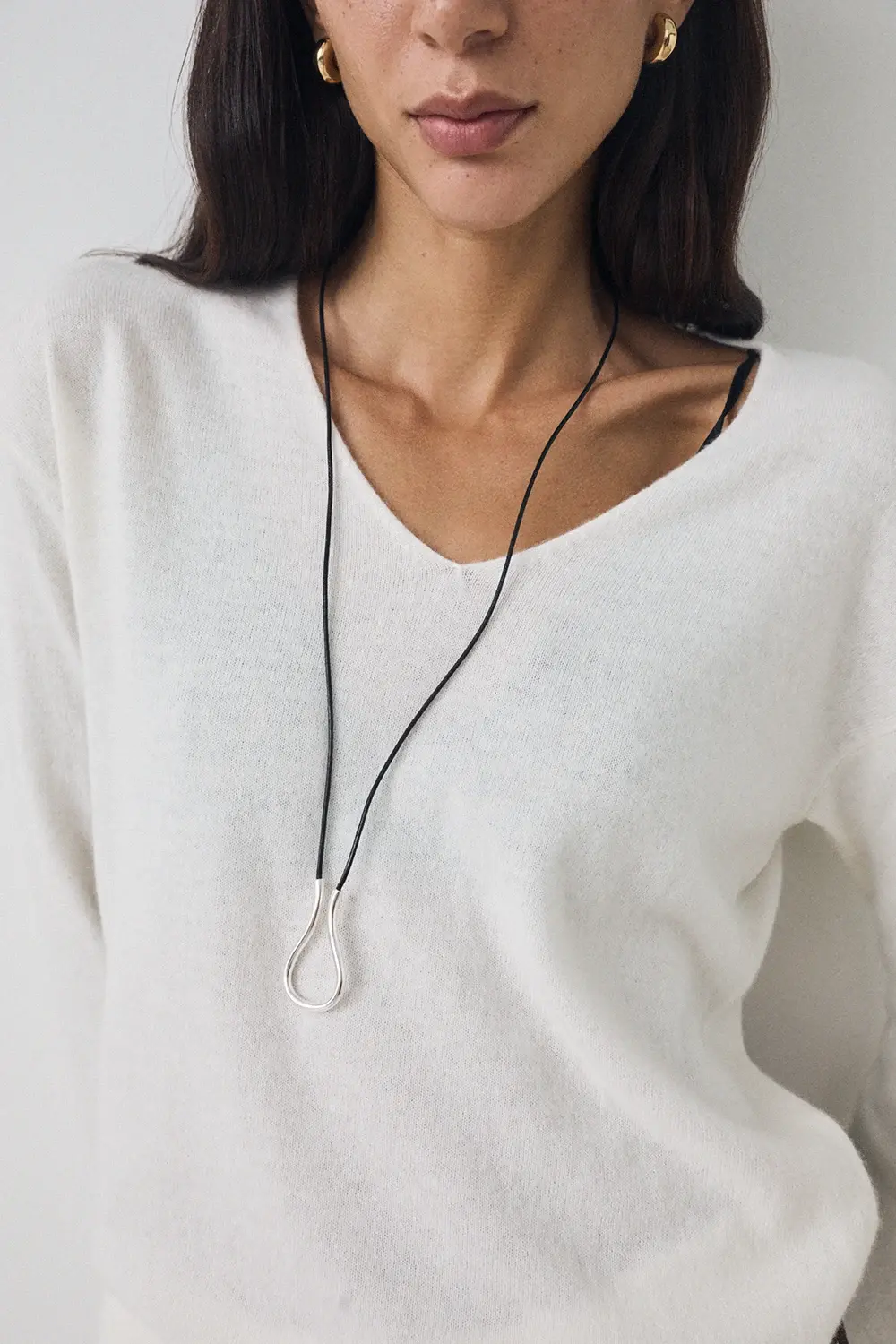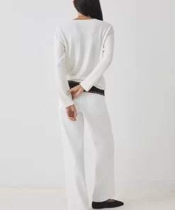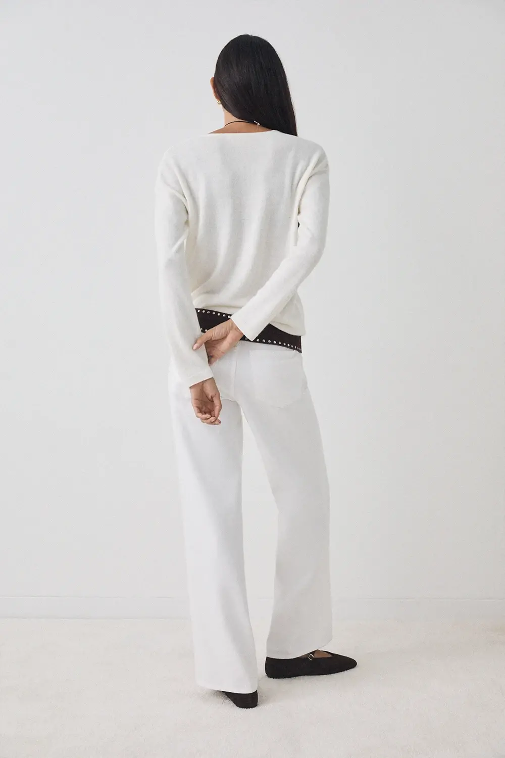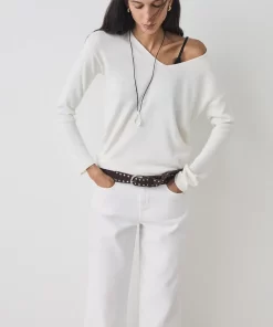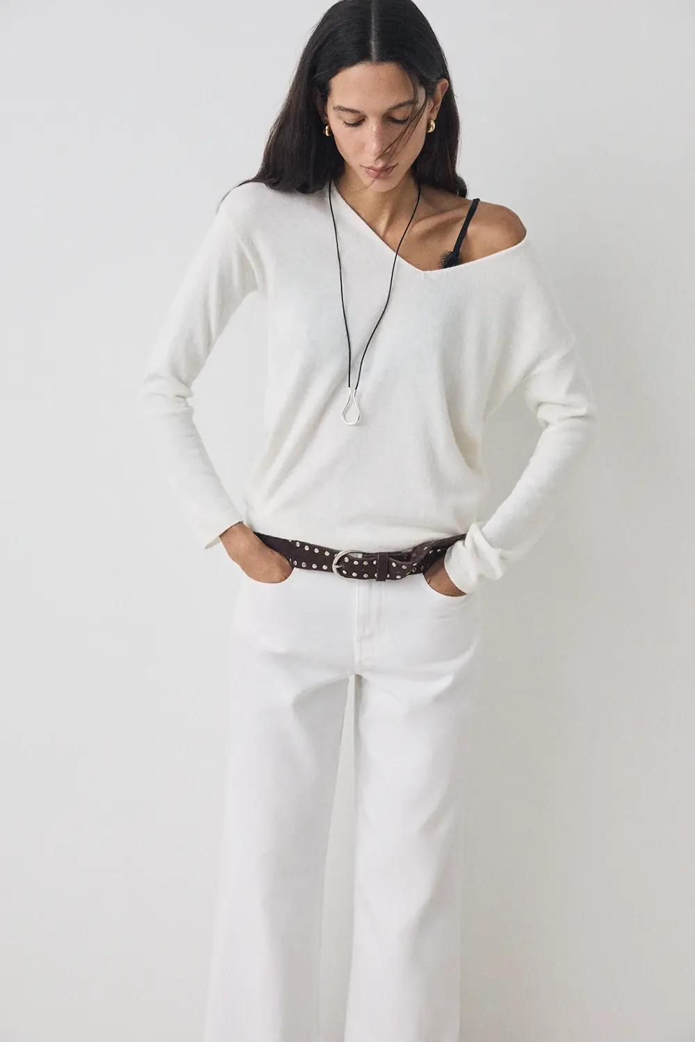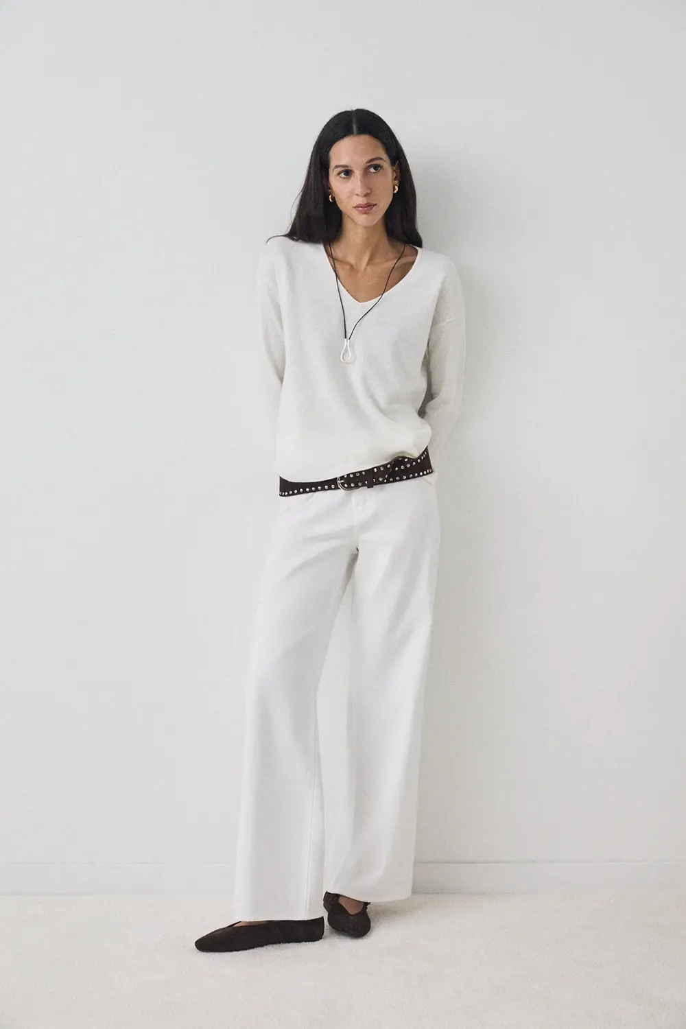 Product descriptionSku:303850-1020 // J.COLLEGE Basic fine-gauge knit sweater (gauge 12). White color. V-neckline. Straight, non-fitted cut. Semi-sheer cashmere wool fabric. Garment length for size S: 58 cm.